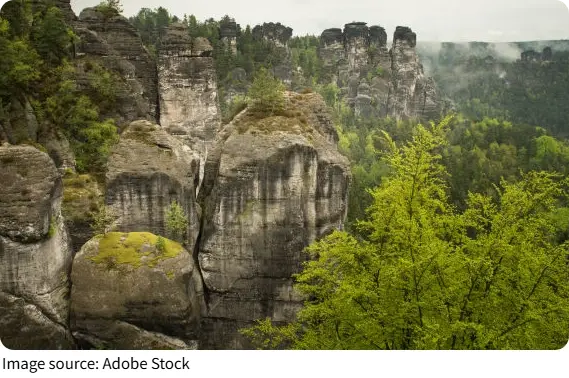 About 75% of the range lies in Germany, with the rest in the Czech Republic. Over millions of years, erosion has sculpted dramatic cliffs, towers, and arches, creating landscapes that feel almost otherworldly.